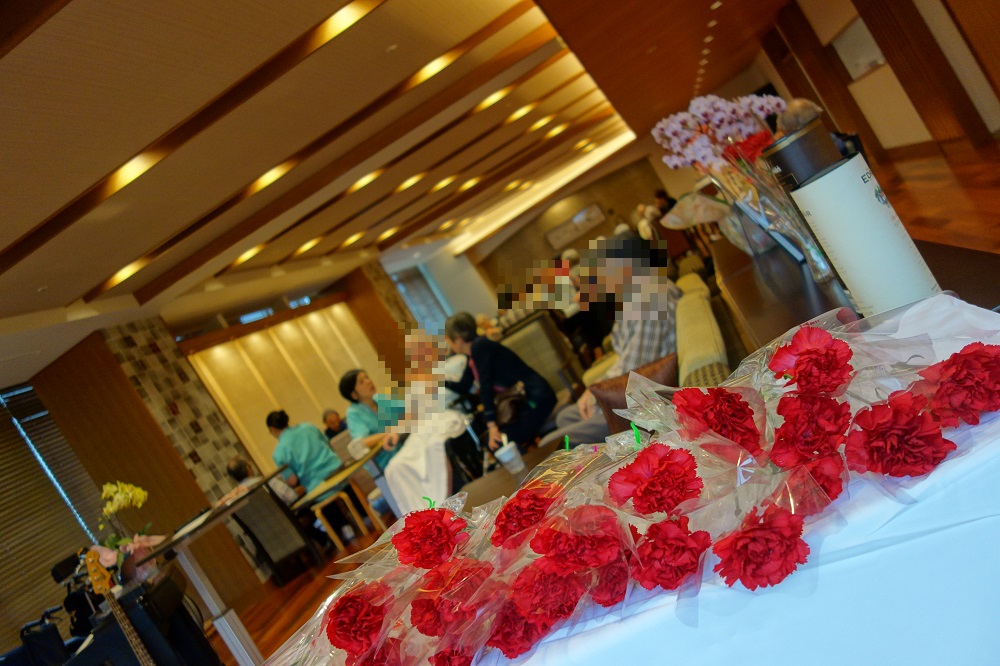母の日のイベントでお茶会を行いました。 お昼ご飯も「母の日特別メニュー」をご提供し、 オヤツの時間にはスタッフによる音楽セッションと手作りイチゴスムージーをご提供致しました。