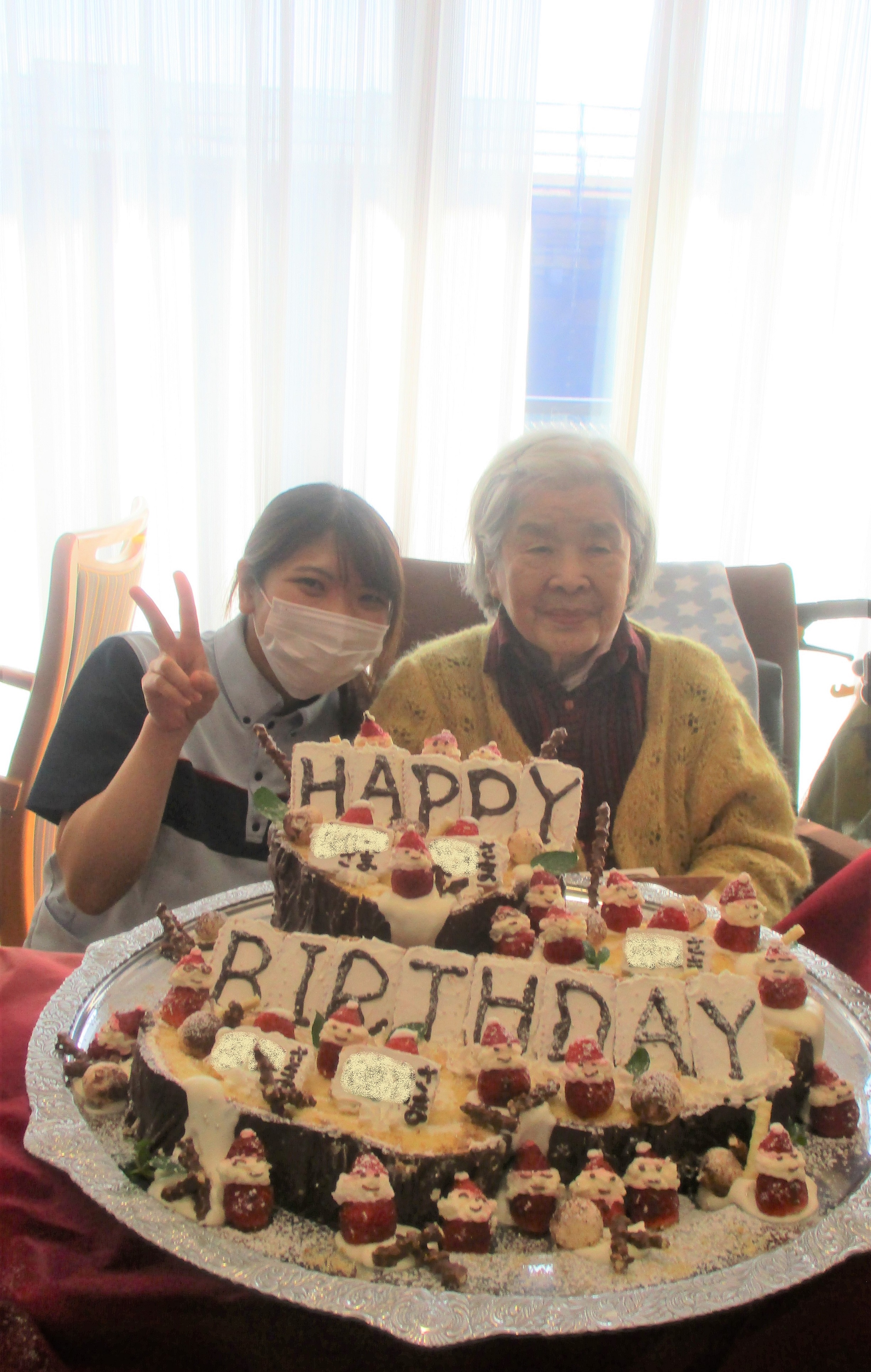 12月のお誕生日会のケーキをご紹介します。シェフが腕によりをかけた手作りケーキのクリスマスバージョンです。 今月がお誕生日の皆様と一緒に、ケーキを振る舞い盛大にお祝いさせていただきました。