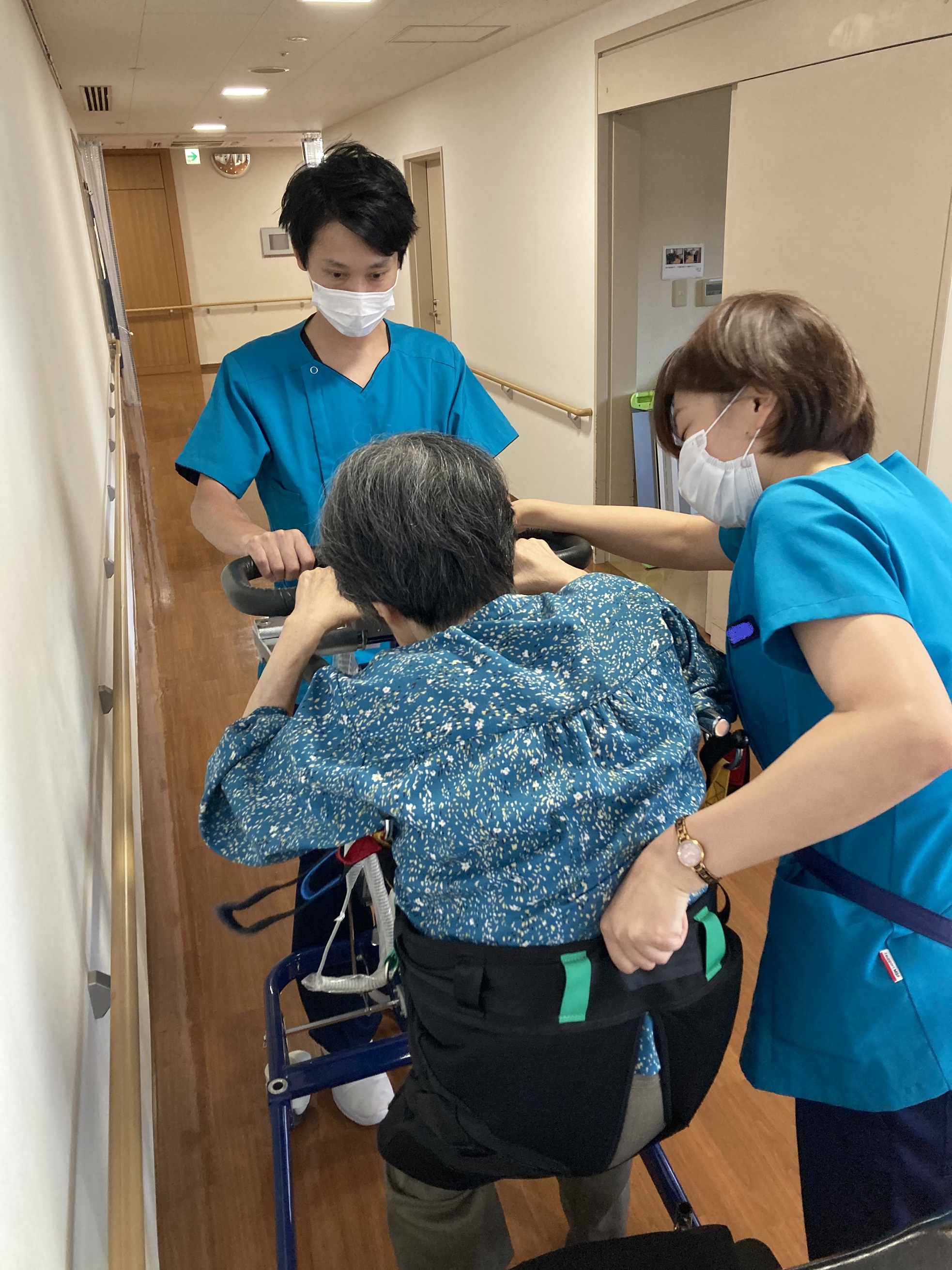 普段は車椅子で移動される方でも理学療法士が付き添いの元、歩行訓練を実施しています。