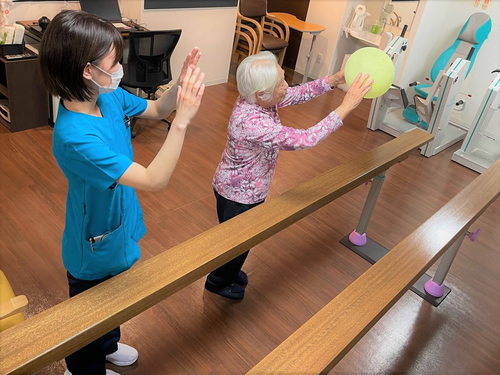 複数人で、歩行練習やバランス練習などを行います。集団で行うことにより、人数効果(私も頑張ろうという気持ち)が期待されるプログラムです。