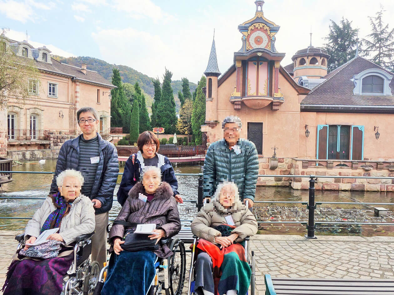 「旅行や温泉にもう一度行きたい」というご入居者の思いを実現するために立ち上げたプロジェクトです。自立度の高い方だけでなく、車イス使用の方や認知症の方、経管栄養の方等、多くの皆様にご参加いただいています。お身体へのご負担の軽減や安全を最優先し、旅行プランをご提案いたします。
