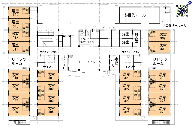 周りに気を遣わず生活できるよう、心身のご状態が近い方を同じフロアにお集まりいただいています。1階は身の回りのことがご自身で出来る方にお暮らしいただくフロア、2階は医療的ケアが必要な方にお暮らしいただくフロア、3階は身の回りのお手伝いが必要な方にお暮らしいただくフロアとなっております。